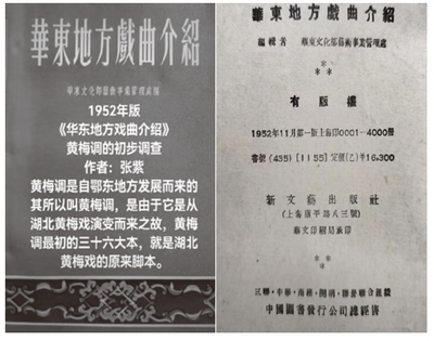 1952年11月出版的《华东地方戏曲介绍》,其中张紫的文章介绍了针对黄梅调的初步调查:黄梅调自鄂东地方发展而来,之所以叫黄梅调是由湖北黄梅戏演变而来,黄梅调最初36本戏就是湖北黄梅戏的原来脚本。